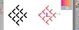 Выделите узор и нажмите клавишу G, и выберите в меню Window>Gradient/Окно>Градиент. Выберите два цвета из палитры Swatch/Образцы, из которых создайте градиент. При помощи одноименного инструмента растяните градиент как показано на картинке выше.