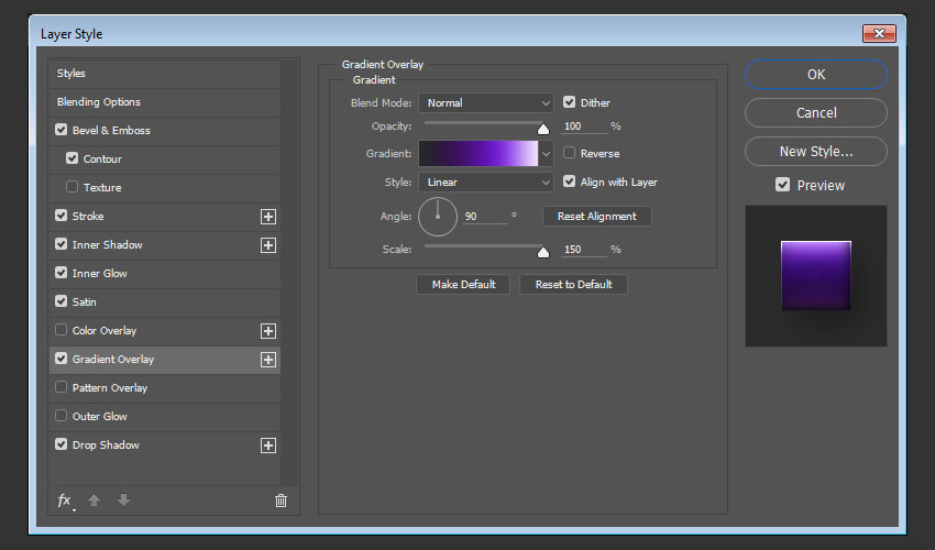 Кликните дважды по копии слоя, чтобы открыть стили слоя и выберите Gradient Overlay/Перекрытие градиента. Настройте параметры как показано ниже, используя цвета #3d3d3d и #151515.