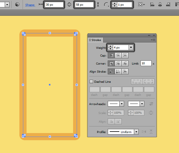 Переключитесь на соответствующий слой. Возьмите инструмент Rounded Rectangle/Прямоугольник со скругленными углами и создайте фигуру размером Corner Radius) в 1 px. Укажите объекту обводку оранжевого цвета #EDAE49 и толщину обводки 4 px. Вы можете преобразовать контур в заливку, выбрав в меню Object > Expand > Fill & Stroke/Объект>Разобрать>Заливку и обводку.