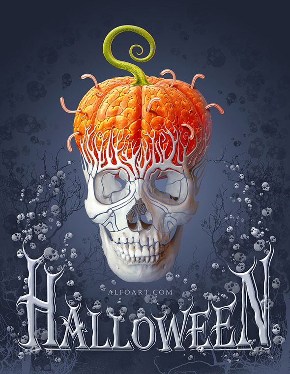Halloween Card. How to create creepy skull with the pumpkin brains effect with photoshop. Free skull brushes and card elements.