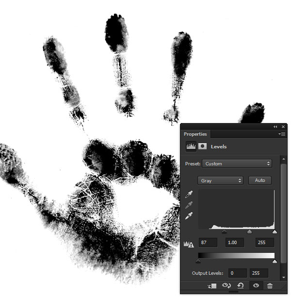 Откройте отсканированное изображение в Photoshop. Увеличьте контраст при помощи Image > Adjustments > Levels/Изображение>Коррекция>Уровни. Потяните внешние ползунки внутрь так, чтобы светлые места стали четко белыми, а темные четко черными.