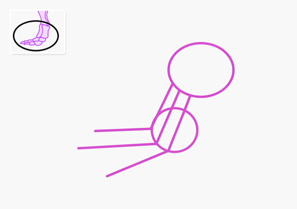 Начнем со ступни. Рисуем два круга и три или четыре линий для пальцев.