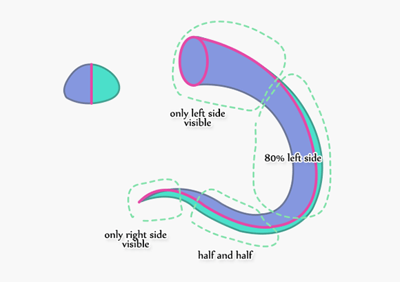 Самое главное правило — это запомнить, что у хвоста есть две стороны, которые не могут быть видны полностью и одновременно. Чем больше вы видите одну сторону, тем меньше видна вторая. Для естественного эффекта сначала рисуем центральную линию (розовая) и затем добавляем две стороны хвоста.