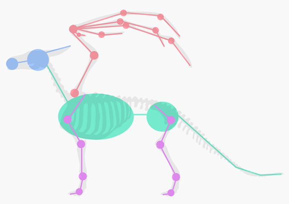 Лучше всего начинать со скелета. Расположение суставов и костей позволит дракону выглядеть вполне реалистично не зависимо от того, что вы планируете с ним делать потом. Используем смесь скелетов собаки (T-Rex) и летучей мыши.