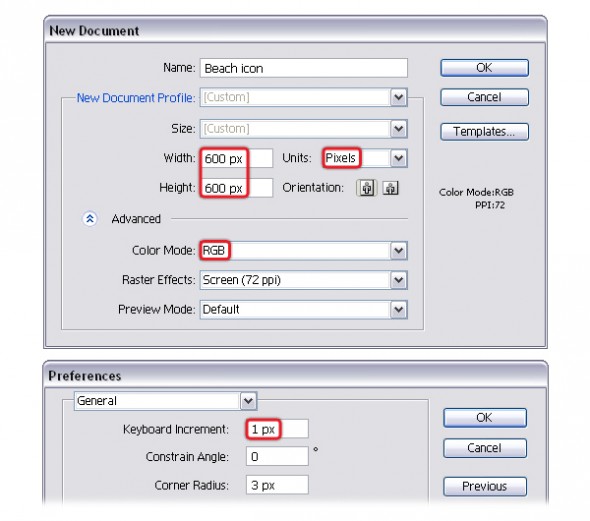 Запустите Illustrator и в меню найдите File > New, чтобы открыть новый документ. Введите имя и укажите размеры, после чего выберите Pixels (Пиксели) в качестве единицы измерения и RGB в графе Color Mode. Теперь зайдите в Edit > Preferences > General и установите параметр Keyboard Increment на 1px. Эти настройки помогут вам в точности повторить урок.