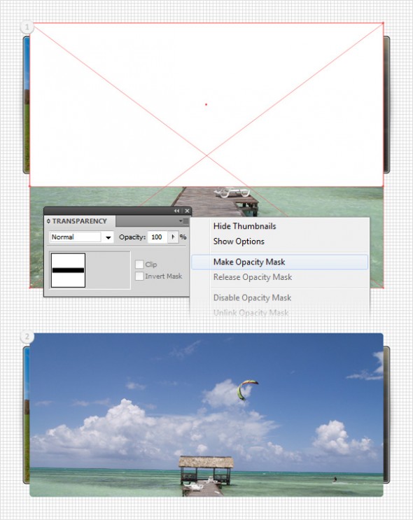 Откройте панель Transparency (Window> Transparency). Выбирать изображения и белую форму, сделанную в предыдущем шаге. Откройте выпадающее меню панели прозрачности и нажмите на кнопку Make Opacity Mask (Сделать непрозрачную мазку). В конце концов изображение должно выглядеть, как на втором скриншоте. Перейдите в панель слоев и заблокируйте его, чтобы убедиться, что вы случайно не переместили и не изменили его.