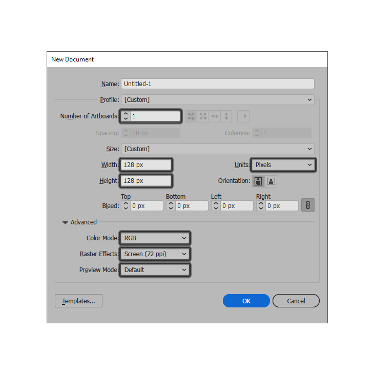 Создайте новый документ. Для этого нажмите Control-N и укажите параметры как показано ниже: