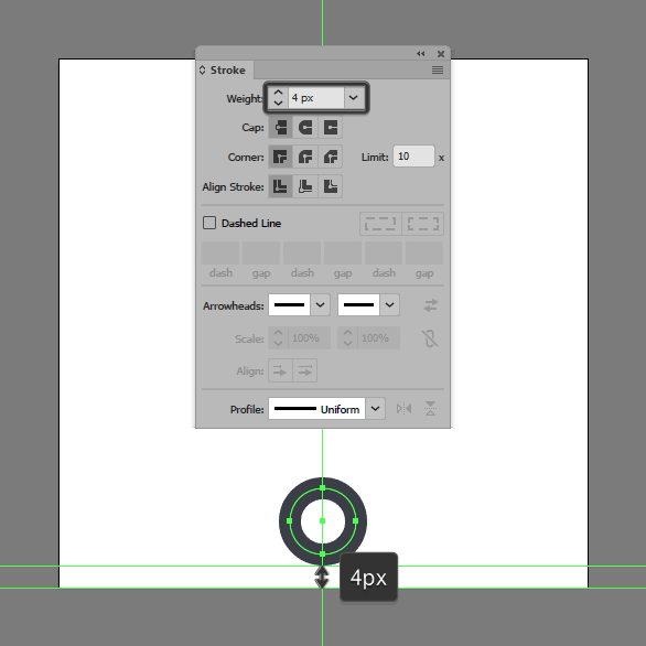 Начнем работу над ключом с круга размером 12 x 12 px. Укажите ему обводку толщиной в 4 px в палитре Stroke/Обводка, и укажите ей цвет #383C44. Затем выровняйте круг по вертикальному центру относительно холста и поместите вниз, как показано ниже.