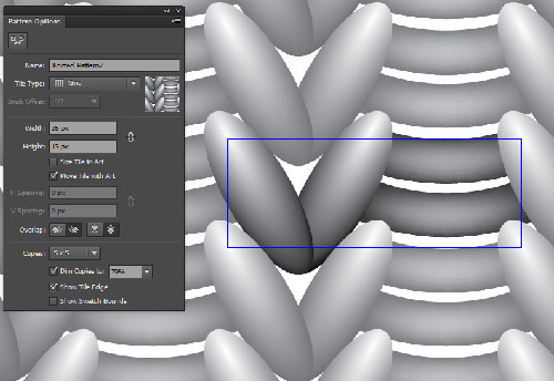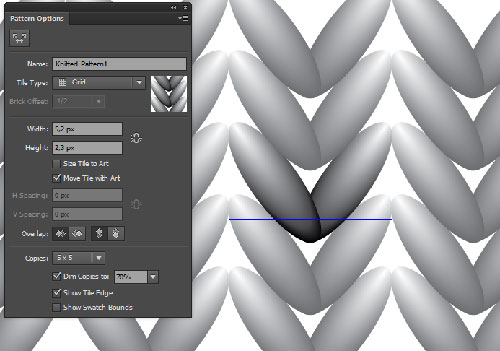 6. Удалите правую пару продолговатых фигур. Выделите левую пару и две изогнутые фигуры и в меню выберите Object>Pattern>Make/Объект>Узор>Создать. В режиме редактирования вновь настройте параметры Width/Ширина и Height/Высота, чтобы получить плотный узор. Также обратите внимание на параметр Overlаp/Перекрытие. Выберите режимы Right in Front/Правый впереди и Bottom in Front/Нижний впереди. Назовите паттерн «Knitted-Pattern-2» и нажмите Done/Готово когда закончите.