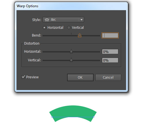 3. Не снимая выделения с линии, выберите в меню Effect>Warp>Arc/Эффект>Деформация>Дуга. Выберите опцию Horizontal/Горизонтально и уменьшайте значение Bend/Изгиб так, чтобы линия немного изогнулась, как на картинке ниже. Чтобы вам было удобнее работать, включите галочку предварительного просмотра. Когда вас устроит результат, нажмите OK.