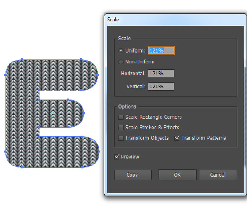 5. Вы можете редактировать паттерн, не редактируя объект. Для этого выделите одну из букв и кликните дважды по инструменту Scale/Масштаб. В появившемся окне снимите галочку с Transform Objects/Трансформировать объект и поставьте галочку на Transform Patterns/Трансформировать узоры. Включите предварительный просмотр и при помощи колеса мыши уменьшайте или увеличивайте параметр Uniform/Равномерно в разделе Scale/Масштаб. Когда вам понравится результат, нажмите OK.