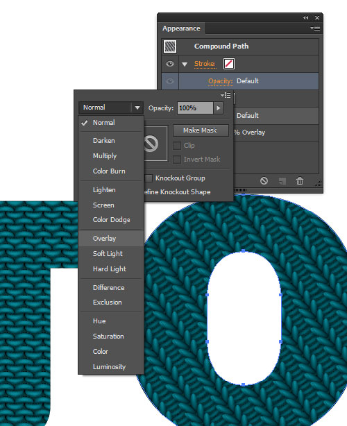 8. Выделите одну из букв и зайдите в палитру Appearance/Оформление. Кликните по параметру Opacity/Непрозрачность, соответствующему заливке с паттерном и в появившемся окне укажите Blending Mode/Режим наложения Overlay/Перекрытие. Сделайте это для всех букв.