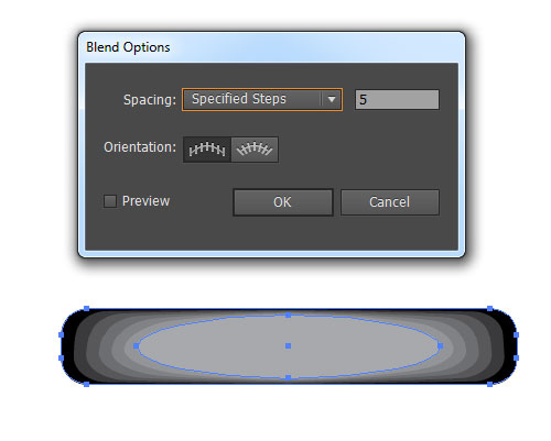 3. Кликните дважды по иконке инструмента Blend/Переход (W). В появившемся окне укажите настройки как показано ниже. Нажмите OK. Теперь выделите черный прямоугольник и серый овал и нажмите Ctrl+Alt+B, чтобы создать переход от одной фигуры к другой.