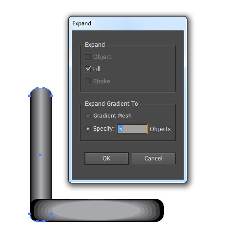 4. Не снимая выделения с изогнутой линии, зайдите в меню Object/Объект и выберите Expand Apperance/Разобрать оформление. Зайдите в меню Object/Объект еще раз и на этот раз выберите Expand/Разобрать. В появившемся окне оставьте галочку напротив Stroke/Обводка и нажмите OK. Дублируйте фигуру и разместите копию немного ниже оригинала.