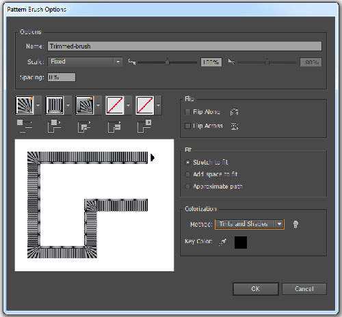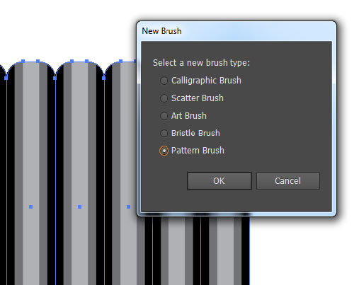 7. Выделите все прямоугольники, откройте палитру Brushes/Кисти и нажмите на иконку New Brush/Новая кисть. В появившемся окне выберите Pattern Brush/Узорчатая кисть и нажмите OK.