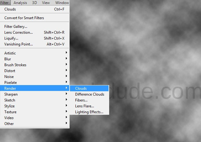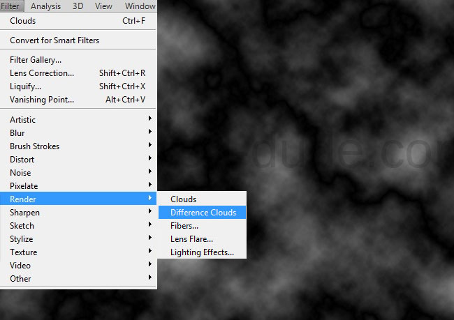 Вновь зайдите в меню и выберите Filter>Render/Фильтр>Рендеринг и выберите Difference Clouds/Облака с наложением.