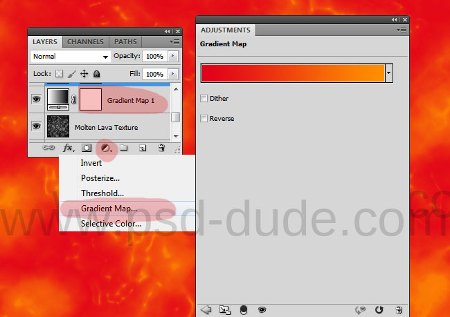 Чтобы добавить больше ярких, огненных цветов, добавьте корректирующий слой Gradient Map/Карта градиента между слоями с текстурой лавы. Используйте цвета #e10119 и #fe8f00