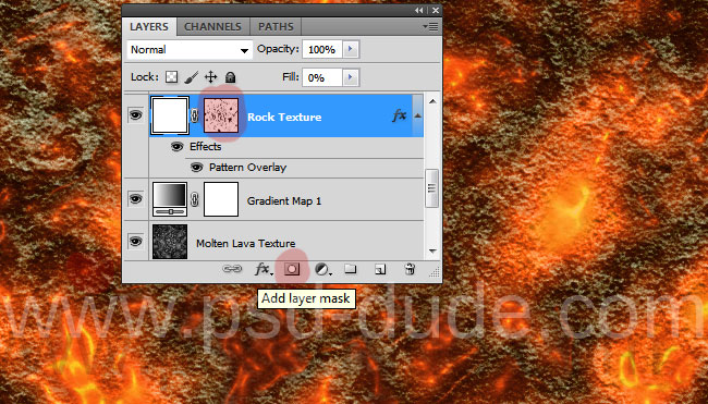 Не снимая выделения, сделайте активным слой Rock Texture и кликните по иконке Add Layer Mask/Добавить слой-маску. Удалите слой Mask Layer.