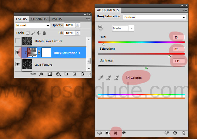 Дублируйте слой Lava Texture и переименуйте копию в Molten Lava Texture (Текстура сияющей лавы). На этом этапе скройте слой Molten Lava Texture. Вернитесь к первому слою Lava Texture и создайте поверх него корректирующий слой Hue/Saturation, сделав его обтравочной маской для этого слоя.