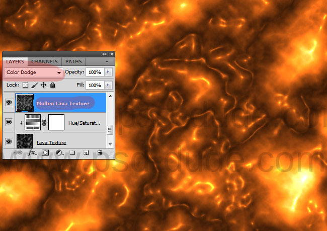 Смените режим наложения (blend mode) слоя Molten Lava Texture на Color Dodge/Осветление основы. Вот что должно получиться: