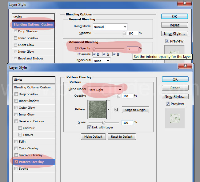 Создайте новый слой поверх остальных и назовите его Rock Texture. Залейте слой любым цветом и укажите ему стиль слоя Pattern Overlay/Перекрытие узора. Укажите параметры как показано ниже и выберите только что созданный нами узор каменной текстуры.