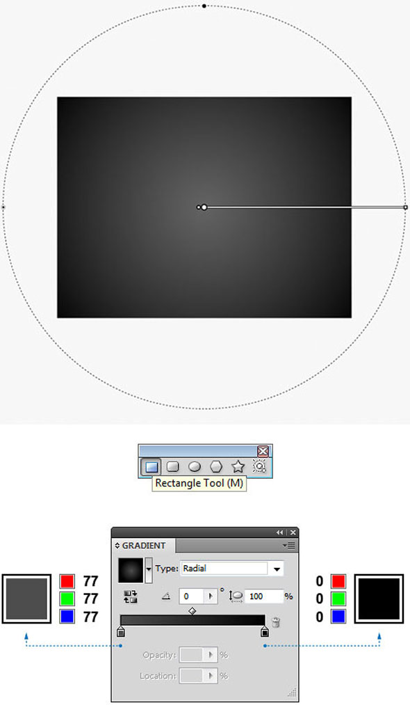 Создайте новый документ размером 800 x 600px. Инструментом Rectangle/Прямоугольник (M) нарисуйте прямоугольник по размеру документа. Теперь в палитре Gradient/Градиент укажите прямоугольнику радиальный градиент от темно-серого (R=77 G=77 B=77) до черного (R=0 G=0 B=0). Инструментом Gradient/Градиент растяните его как показано ниже.