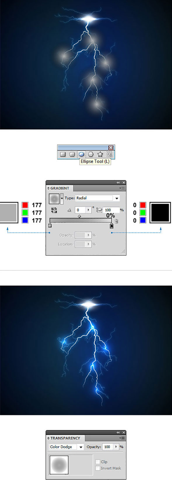 Инструментом Ellipse/Эллипс создайте идеальный круг (удерживайте Shift для этого) размера 150 x 150px. Залейте круг радиальный градиентом следующих цветов: светло-серый (R=177 G=177 B=177) и черный (R=0 G=0 B=0). Смените режим наложения на Color Dodge/Осветление основы. Сделайте несколько копий и расположите их по всей молнии.