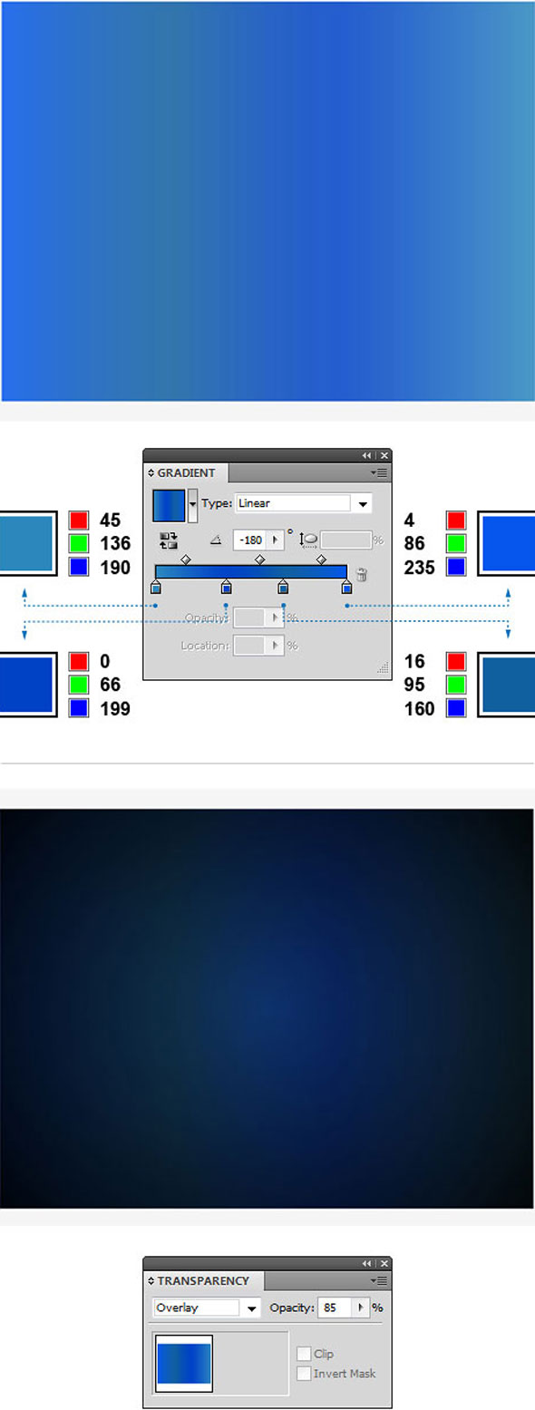 Копируйте серо-черный прямоугольник и вставьте копию поверх. Откройте палитре Gradient/Градиент и укажите копии прямоугольника линейный градиент следующий оттенков синего: R=45 G=136 B=190, R=0 G=66 B=199, R=16 G=95 B=160, R=4 G=86 B=235. Не снимая выделения в палитре Transparency/Прозрачность смените Blending Mode/Режим наложения на Overlay/Перекрытие (Opacity/Непрозрачность 85%).