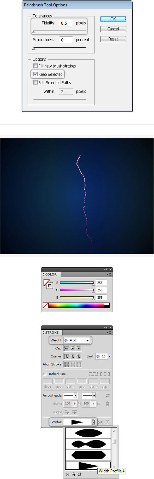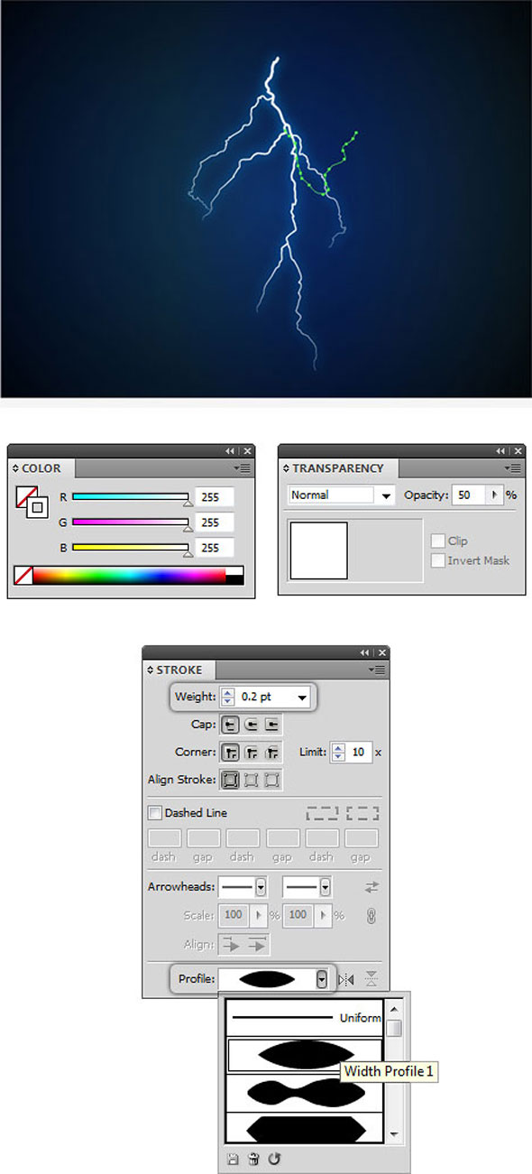 Давайте нарисуем ответвления света. Инструментом Paintbrush/Кисть (B) нарисуйте ответвление от молнии. Не снимая выделение с линии, и в палитре Stroke/Обводка выберите ‘Width Profile 1′. Укажите обводке толщину в 0.2pt и белый цвет (R=255 G=255 B=255). В палитре Transparency/Прозрачность снизьте Оpacity/Непрозрачность до 50%.