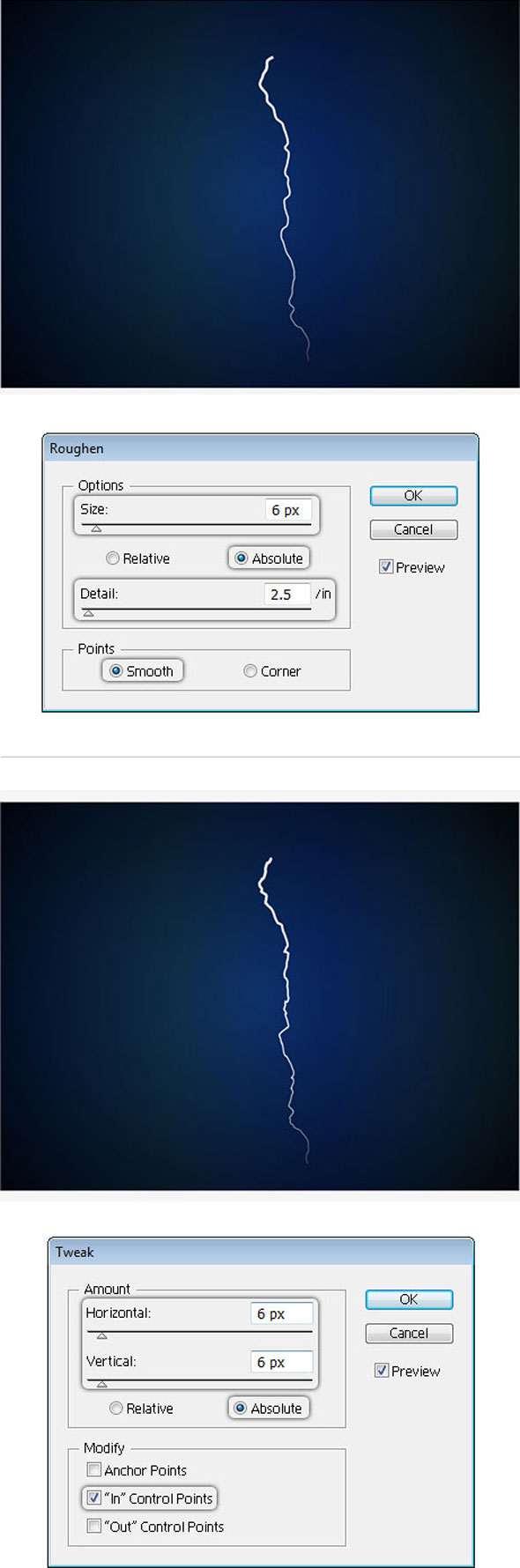 Теперь в меню выберите Effect > Distort & Transform > Tweak…/Эффект>Исказить и трансформировать>Помарки. Укажите параметры как на четвертой картинке ниже.