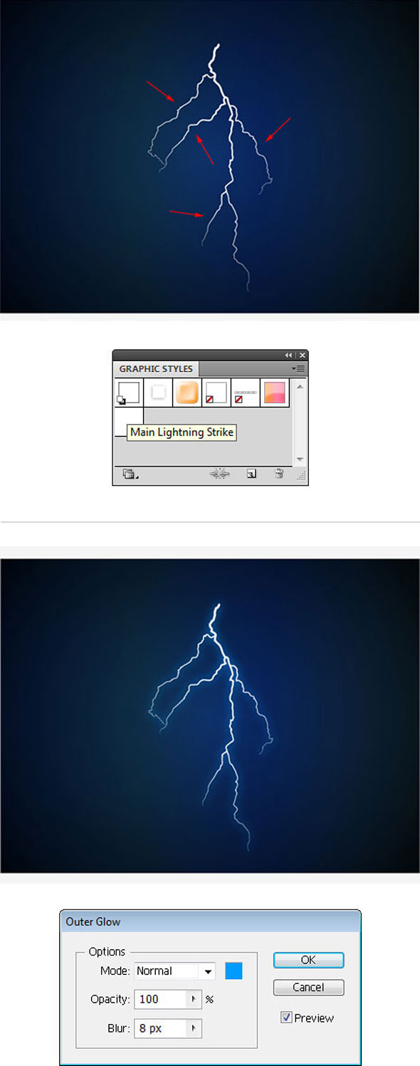 Сгруппируйте все линии составляющие молнию (Ctrl+G) и в меню выберите Effect > Stylize > Outer Glow…/Эффект>Стилизация>Внешнее свечение. Примените параметры как показано на четвертой картинке ниже.
