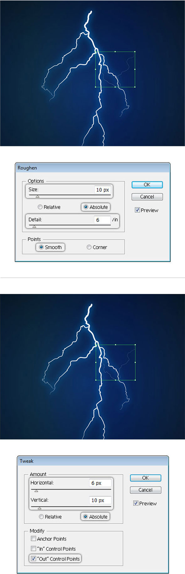 Теперь в меню выберите Effect > Distort & Transform > Tweak…/Эффект >Искажение и трансформация>Помарки. Настройте параметры как показано на четвертой картинке ниже.