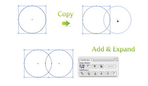 Выделите круг с помощью инструмента Selection Tool / Выделение, затем удерживайте клавишу Alt (так копируется выделенный объект) и клавишу Shift (ставит объект на место). С этими нажатыми клавишами сделайте и перетащите еще одну копию круга. Выделите оба круга и примените Add / Добавить и Expand / Разобрать в панели Pathfinder / Обработка контуров.
