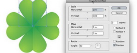 Вот где нам пригодится эффект трансформирования! Выделим обе части листочка и сгруппируем их при помощи Group/ Сгруппировать. Теперь идем в Effect > Distort & Transform > Transform / Эффект > Исказить и трансформировать > Трансформировать и открываем окно трансформации. В этом окне нам нужно поменять количество копий на 3, указать поворот на 90 градусов и выбрать точку внизу по центру (смотрите на картинку внизу — там, где сбоку матрица 3 на 3).