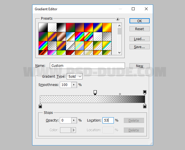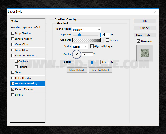Создайте новый слой, назовите его Rock Wall и вставьте в него изображение stone texture (текстура камня). Добавьте layer style/стиль слоя Gradient Overlay/Перекрытие градиента с параметрами как показано ниже. Так мы создадим эффект виньетки.