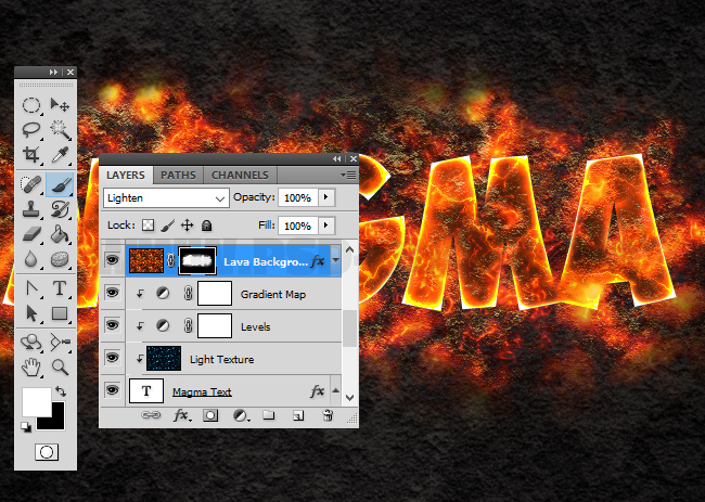 Создайте новый слой и назовите его Lava Background. Поместите в этот слой текстуру лавы lava seamless texture. Укажите слою blend mode/режим наложения Lighten/Замена светлым.