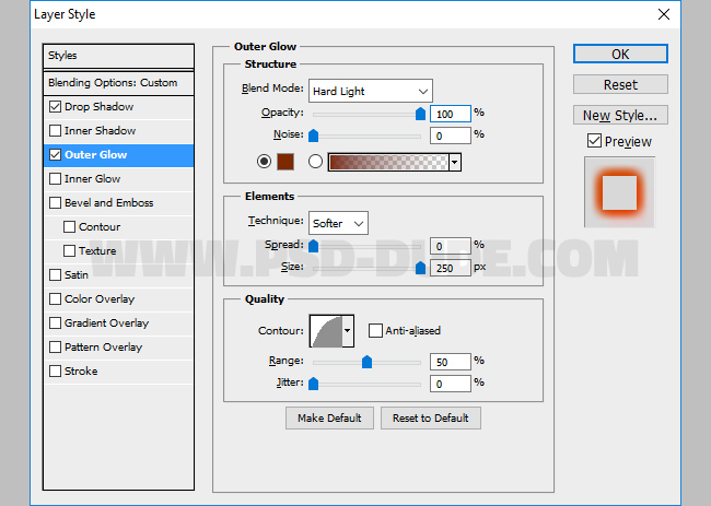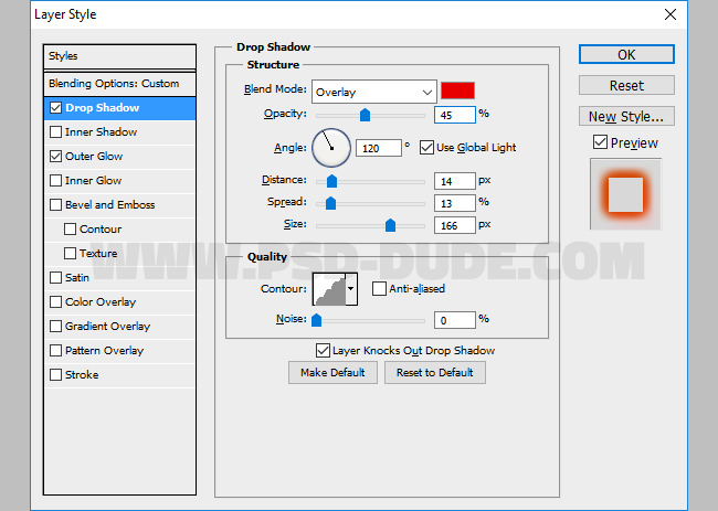 Укажите слою стиль Drop Shadow/Тень (цвет #e70000 и настройки как показано ниже), а также стиль Outer Glow/Внешнее свечение (цвет #7d2900).