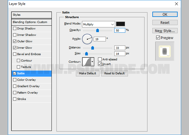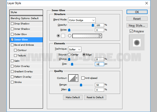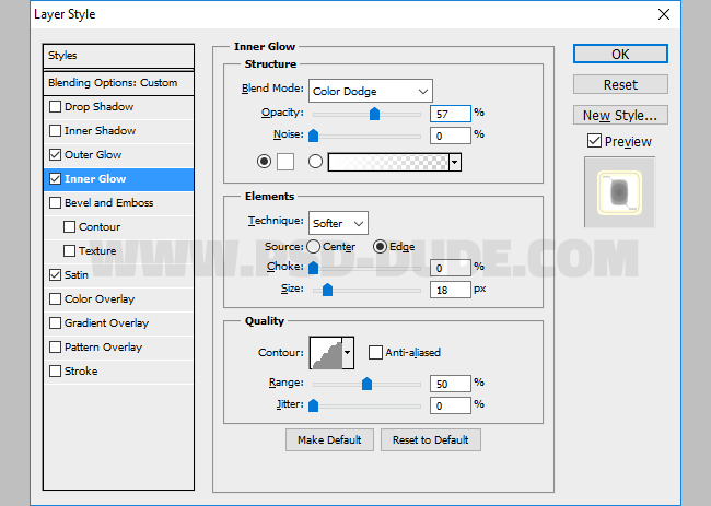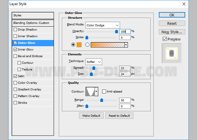 Перетащите слой Fiery Effect поверх остальных слоев. Укажите ему Fill/Заливку в 0%. Добавьте стили слоя Outer Glow/Внешнее свечение (цвет #ff9c00), Inner Glow/Внутреннее свечение (цвет #ffffff) и Satin/Глянец (цвет #171717).
