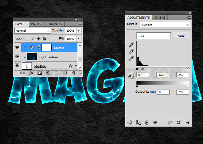 Создайте новый слой и назовите его Light Texture. Поместите в этот слой текстуру electric texture. Кликните правой кнопкой по слою и выберите Create Clipping Mask/Создать обтравочную маску.