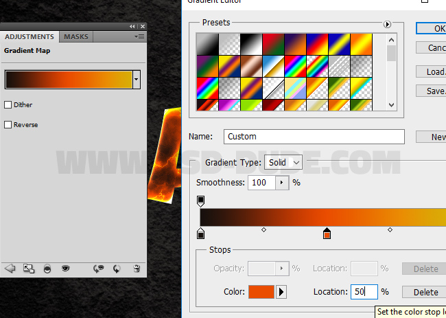 Вы можете раскрасить текстуру в Photoshop при помощи градиентов. Создайте новый корректирующий слой Gradient Map/Карта градиента. Создайте градиент из цветов #16100d , #ea4d00 и #d9af06