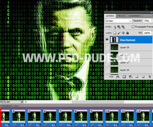 И снова должны быть выделены все кадры. Дублируйте слой Man Portrait вместе с корректирующим слоев Gradient Map/Карта градиента. Поместите копии слоев над слоем Layer 19. Укажите режим наложения слою Man Portrait Screen/Осветление на opacity/непрозрачности в 73%. А теперь немного сместите слой влево, чтобы получить эффект глюка программы.