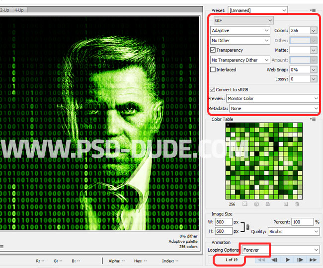 Чтобы сохранить GIF-анимацию, выберите в меню File > Save for Web/Файл>Сохранить для веба и выберите формат GIF. Настройте параметры как показано ниже.