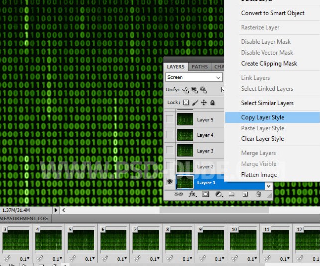 Кликните правой кнопкой по слою Layer 1 и выберите Copy Layer Style/Копировать стиль слоя.