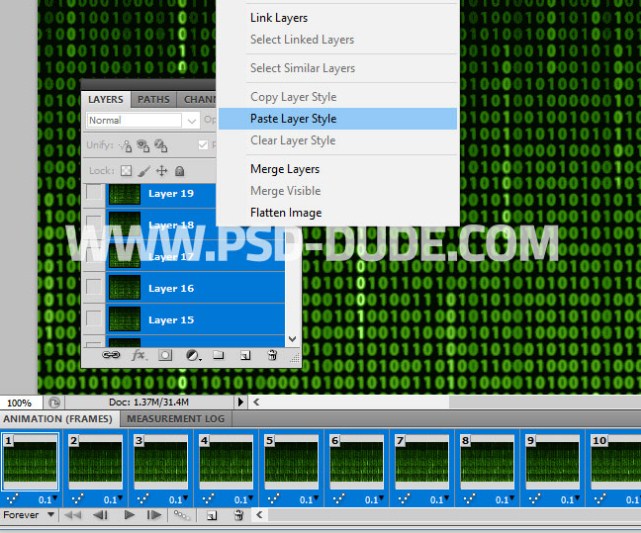Кликните правой кнопкой по выделенным слоям и выберите Paste Layer Style/Вставить стиль слоя. Теперь все слои должны приобрести режим наложения Screen/Осветление. Если вдруг этого не произошло, вам придется произвести эту процедуру последовательно для каждого слоя.