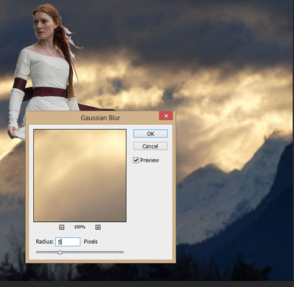 В меню выберите Filter > Blur > Gaussian Blur (Фильтр > Размытие > Размытие по Гауссу). Укажите радиус в 5px.