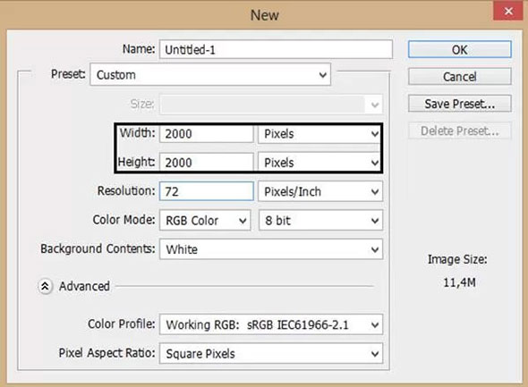 Создайте новый документ в Adobe Photoshop размером 2000px на 2000px.