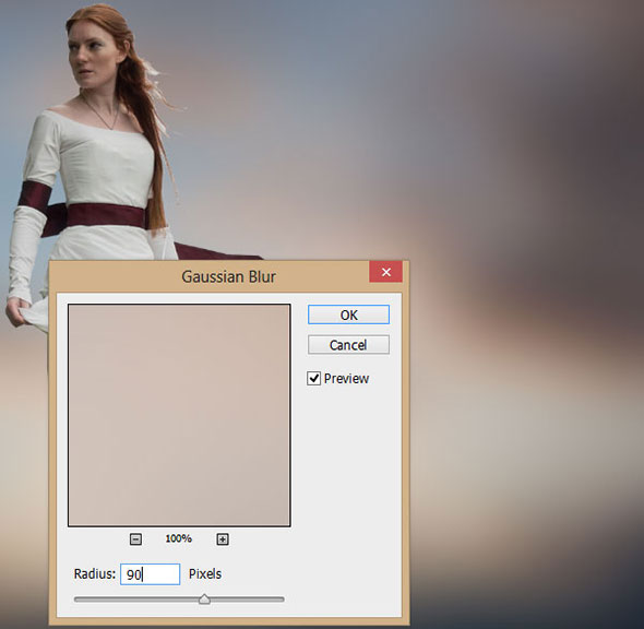 В меню выберите Filter > Blur > Gaussian Blur (Фильтр>Размытие>Размытие по Гауссу) и укажите радиус в 90px.