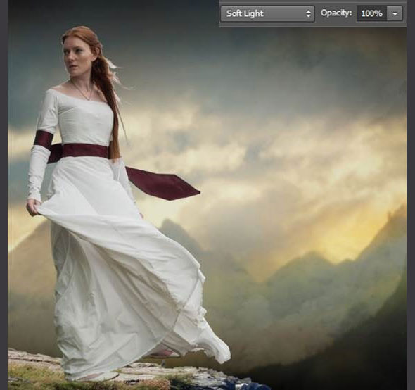 Создайте новый слой. Выберите круглую растушеванную кисть, укажите ей небольшую прозрачность и черный цвет. Рисуйте кистью, чтобы создать тени на правой части лица и платья модели. Смените режим наложения на Soft Light (Мягкий свет).