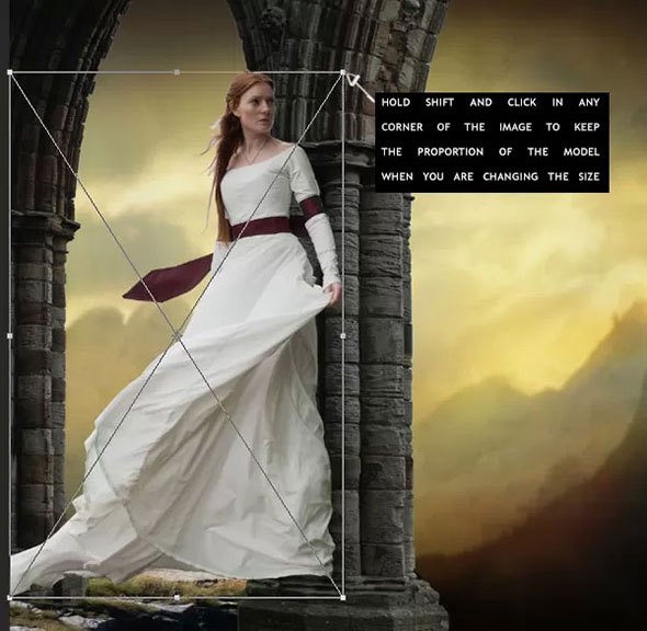 Смените положение модели. Активируйте слой модели и нажмите Сtrl+T, чтобы вызвать опцию Free Transform (Свободной трансформирование). Масштабируйте модель и разместите ее как на картинке ниже.