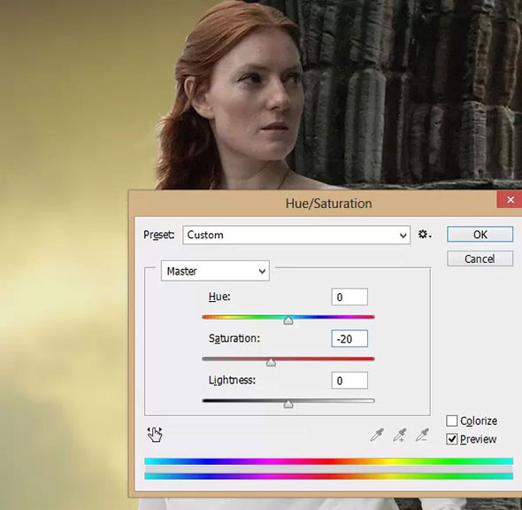Нажмите Ctrl+U и убавьте saturation (насыщенность) цвета кожи модели до -20.